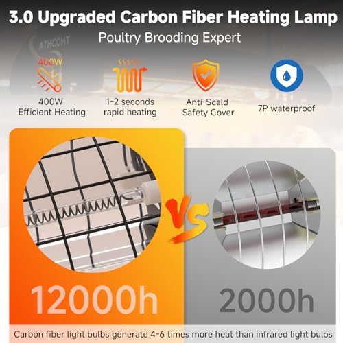 Long-Lasting & Energy Efficient: The first to feature carbon fiber bulbs for a Chicken Coop Heating Lamp. Each carbon fiber bulb lasts up to 12,000 hours (with 1.5 years of warranty). One carbon fiber bulb equals the lifespan of five traditional infrared bulbs. The lamp heats up in just 1–2 seconds, providing an even heat coverage of up to 5,000 cm² for faster and more uniform warmth absorption. With a 90% heat conversion efficiency, it’s three times more efficient than regular bulbs, helping reduce energy consumption