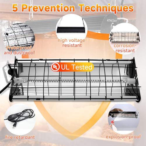 5-in-1 Safety & Durability Upgrade: Built for long-lasting protection, features a sturdy aluminum composite housing and a heavy-duty stainless steel mesh cover to shield both the bulb and your flock. The upgraded design is heat-resistant, waterproof, dustproof, shatterproof, and drop-resistant, ensuring reliable use in any coop environment. Certified UL power cord and IP67 waterproof rating provide added safety without the need for disassembly. Fire-retardant materials and reinforced construction deliver full protection and peace of mind for your chickens year-round