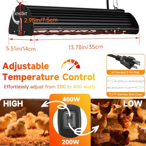 Dual Power & Adjustable Design: Easily adjust between 200W and 400W to match different weather and animal needs. The adjustable hanging height ensures precise heat distribution,Whether you’re using it in a small brooder or a large livestock area, this lamp lets you choose the perfect heat level. Plus, with its adjustable height, you can position the lamp for maximum efficiency, giving you complete control over your animals’ environment.