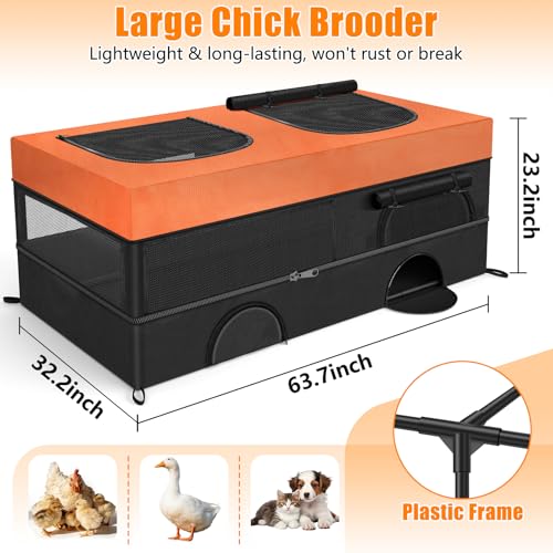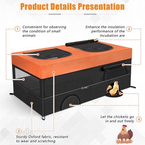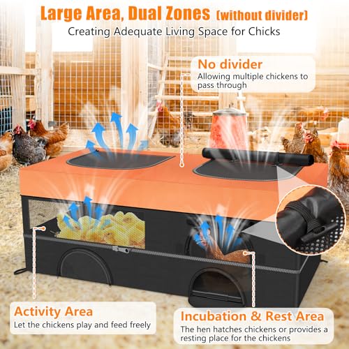 Spacious Dual Zones, One Happy Home: Say goodbye to crowded chicken brooder box! Our innovative divider-free design creates a naturally spacious environment where chicks can play and feed freely, while hens brood undisturbed. The clever layout separates lively activity areas of the chick brooder box from cozy resting corners—adapting as your chicks grow and ideal for households with multiple small pets (brooding up to 30-35 baby chicks)