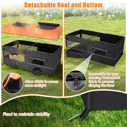 Designed for Convenience & Cleanliness: Both the roof and floor are fully removable! Open up the top of the brooder box to welcome in sunshine and nature, or customize the interior with heating pads, soft bedding, or nesting nooks (not included). The zippered floor detaches in seconds for easy cleaning and features two chick-sized doors for tiny comings and goings