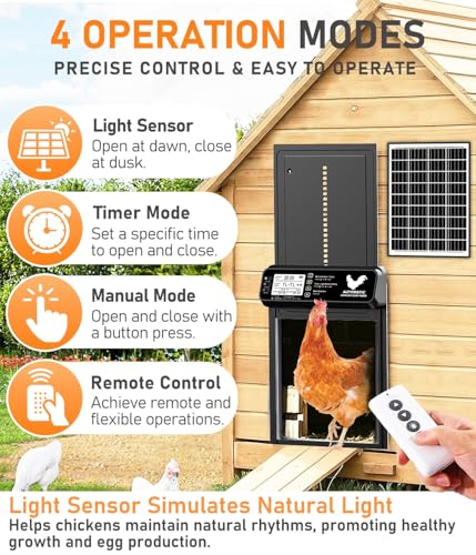 ?Flexible and Efficient?The solar-powered automatic chicken coop door offers four modes: timer, light sensor (20-30 second delay), manual, and remote control. These enhance chicken well-being and simplify management.