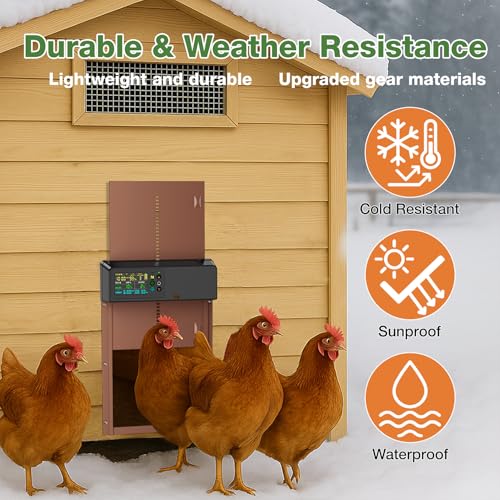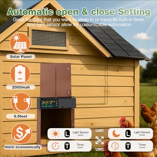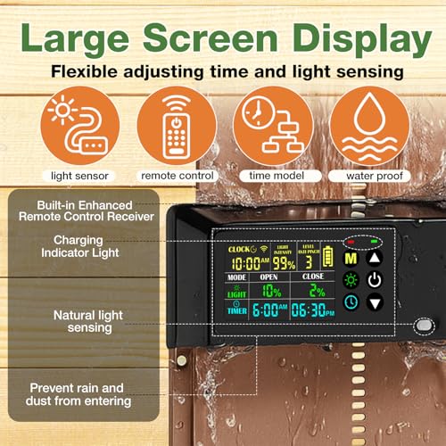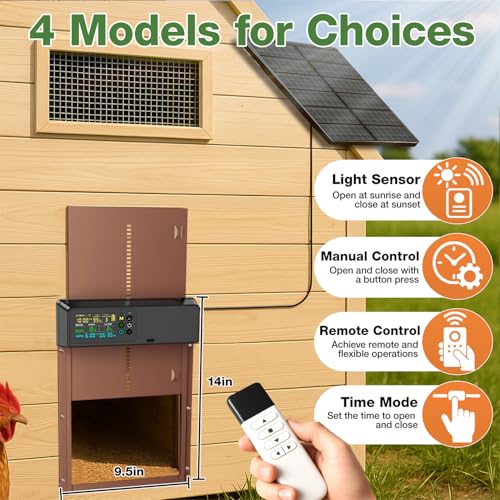 4 Flexible Operating Modes: Choose from Light Sensor (Dawn/Dusk), Timer, Hybrid, or Manual modes to suit your flock's routine. Includes a 100ft range remote control for convenient manual override from your porch