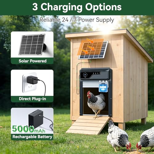 Solar powered with flexible backup charging options – The 7W solar panel keeps the system running outdoors, while the removable 5000mAh battery can be charged indoors when needed. You can also power the door directly with a USB charger, perfect for coops without nearby outlets.