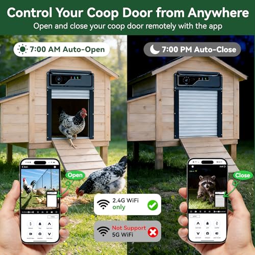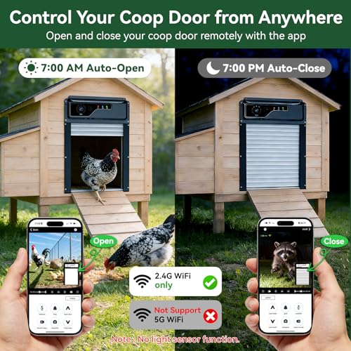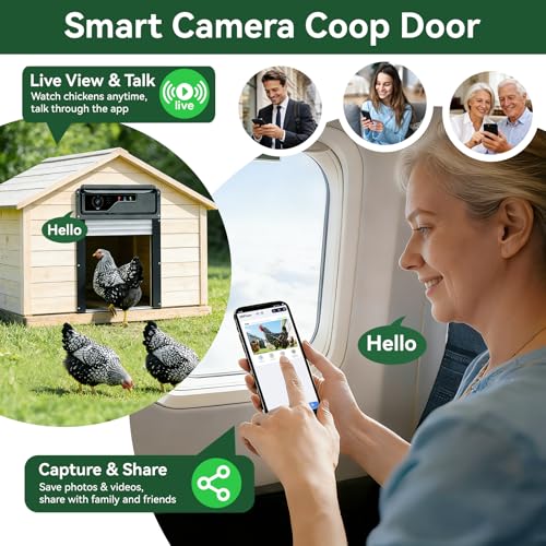 Full control from your phone, even when you’re away – Open or close the chicken coop door remotely, set daily schedules, and check the real-time door status in the app so you’re never guessing at night. Share access with family or a neighbor, use multiple devices, and enjoy the built-in talk feature to check in on your chickens.