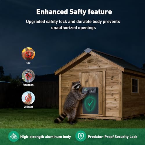 ?Predator-Proof Safety Lock?To stop clever raccoons, foxes, or other predators from accidentally (or deliberately) pressing buttons to open the door, this coop door features an intelligent safety lock. It can only be unlocked using a specific button sequence — random paw presses won’t work. Yes, we really do care about keeping your chickens safe!