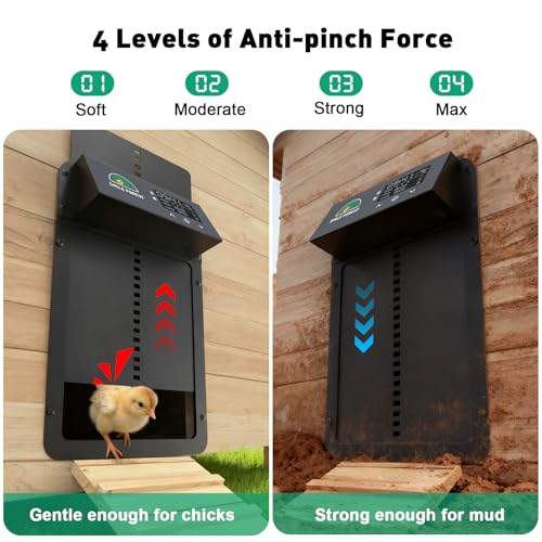 ?Anti-Pinch Automatic Chicken Door?The built-in sensor instantly stops and reverses the door if a chicken is detected underneath — preventing injury every time. Choose from 4 strength levels: gentle mode protects chicks and small birds, while heavy-duty modes power through snow, ice, or mud without jamming.