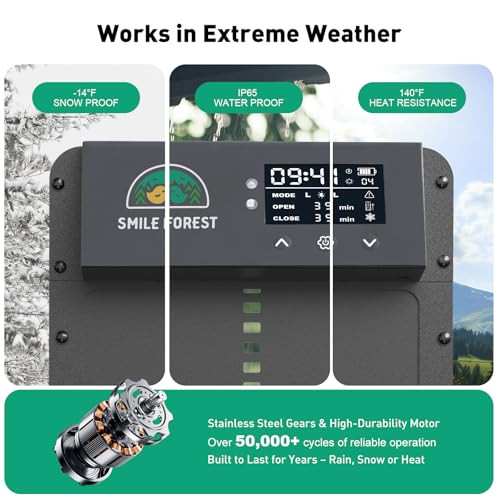 ?Rigorous Testing for Every Chicken Coop Door?Every smile forest auto chicken coop door undergoes rigorous salt-spray, extreme high & low temperature, waterproof (IP65), high-humidity, metal hardness, and 50,000+ cycle motor/button endurance tests. Crafted from heavy-duty aluminum, iron, and stainless steel, it works and charges reliably from -15? deep freeze to 140? extreme heat — snow, ice, rain, or thunder won’t stop it. Your flock stays safe, season after season.
