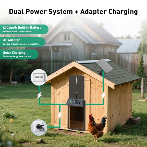 ?Key Specifications?This automatic chicken coop door requires a 7.9 × 12.6 inch (20 × 32 cm) opening, features a built-in LCD screen and 5000mAh battery, and includes a 5W solar panel with 9.8ft (3m) USB-C cable, a 5ft (1.5m) USB-A to USB-C charging cable, mounting screws, and user manual.