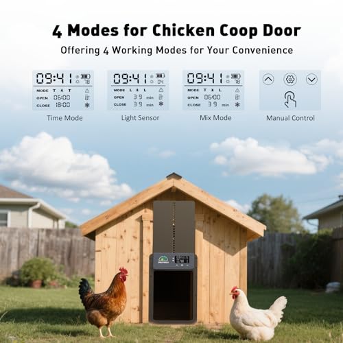 ?Multi-Modes for Chicken Door?This solar chicken coop door offers 4 easy modes: Light sensor mode opens at sunrise and closes at sunset; Timer mode lets you set custom times; Hybrid mode combines both for extra reliability; and manual mode allows instant control anytime. Great for vacations or sleeping in — your chickens will always get out on time in the morning and stay safely locked in at night, protected from predators, with little effort from you.