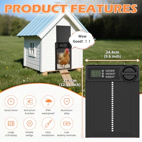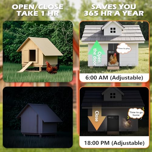 ?Save You Time?You can time your entry and exit according to the regularity of your captive chickens. Manually set the time to open and close the coop door, it will open and close on time at the time you set. The auto chicken coop door not only creates a safe home for your chickens, but you don't need to get up at dawn to open them or get home before dark to close them