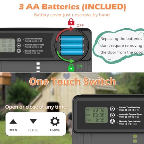 ?Energy Efficient?Battery power is another great feature of this electric coop door. It doesn't require complicated wiring and you don't have to worry about a power outage causing a malfunction. Unlike other coop doors, there is no need to use a screwdriver to open the battery cover, just twist it gently to open it, which is more convenient. Powered by 3 x AA batteries (Included), the display flashes to remind you to change new batteries when they are around consumed