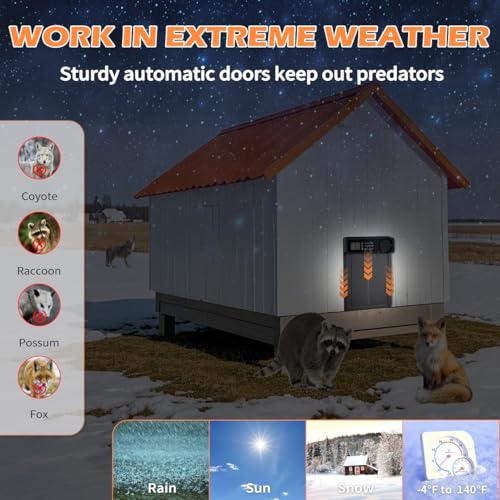 ?Stable in Extreme Weather?The chicken door is made of sturdy aluminium alloy. The battery compartment is waterproof, which prevents rainwater from entering the interior. We have also upgraded the stability of the coop door against the cold. It can Withstands wind, dust, rain and snow in extreme weather conditions from -4°F to 140°F (-20°C to 60°C). You no longer need to manually open the door in harsh weather. The sturdy coop door also keep out predators such as coyotes, foxes and snakes