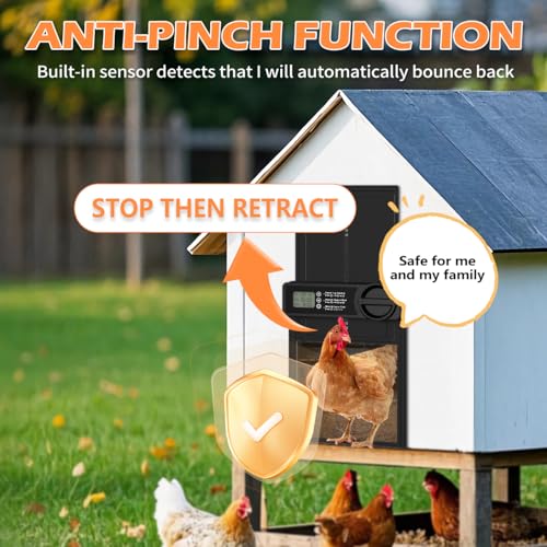 ?Anti-Trap Safety Door?The automatic chicken door has an anti-pinch function with a built-in safety anti-pinch sensor. If the coop door touches a chicken while in the process of closing, the door will immediately lift upwards and remain stationary for 10 seconds. Allow the chickens to safely move away from the door before continuing with the closing procedure. It prevents injury to the poultry. Gives you added peace of mind when you are not there