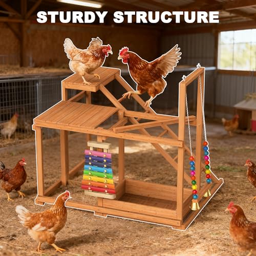 Fun Design: Equipped with interactive toys like colorful beads, a hand chime, and bells, this chicken perch provides auditory and visual stimulation. These engaging features encourage exploration and play, enhancing their environment for happier and more active chickens