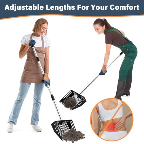Adjustable Length & 10-Inch Scoop Head: This 2 in 1 chicken poop scooper features an adjustable length design with 3 settings (35 inches, 47 inches, 62 inches), making it suitable for users of varying heights and different situations. The 10-inch wide scoop head and precisely sized sifting holes enhances cleaning efficiency, while the ergonomic handle ensures a secure grip for effortless scooping, raking, and transporting.