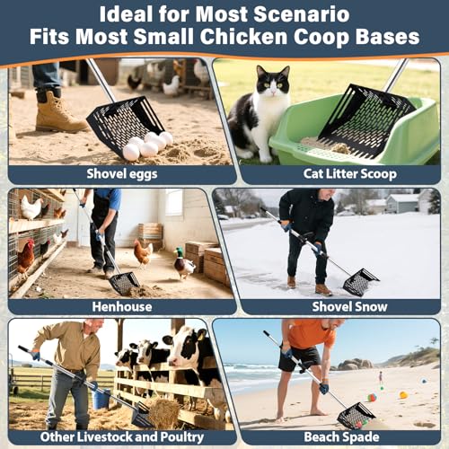 Durable & Sturdy Construction: Constructed from stainless steel and plastic, this heavy-duty chicken poop scooper is built to withstand heavy manure, wet sand, and compost piles. Durable, shatterproof, and lightweight, the sand sifting litter shovel is easy to operate and clean—making it ideal for daily use on farms or in backyard chicken coops.