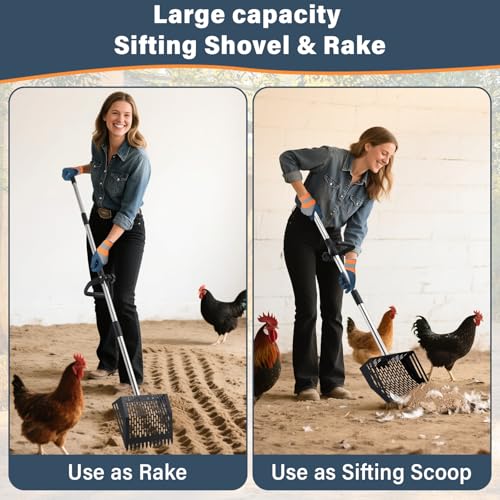 Wide Applications: This chicken poop scooper with ergonomic D-grip is a versatile tool that simplifies waste removal tasks. The sifting shovel for litter can be used as a chicken poop scoop, sifting shovel for litter, or garden rake. Whether you're a gardener, pet owner, or chicken keeper, it's a practical and essential addition to your cleaning toolkit.
