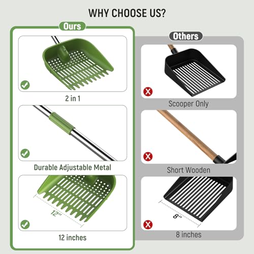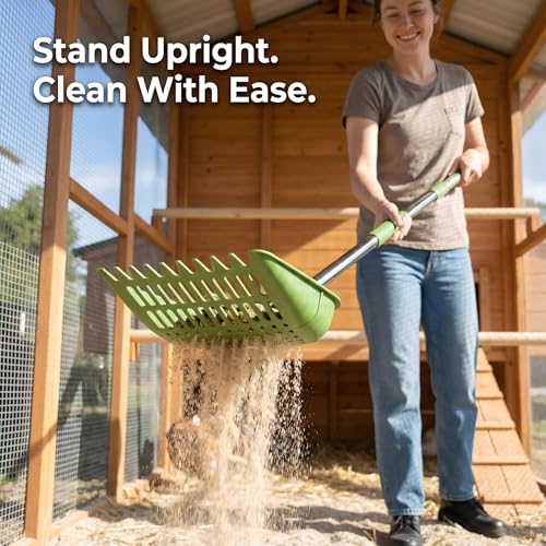 ADJUSTABLE UP TO 68 INCHES - The stainless steel handle adjusts to 3 positions, so you can choose the length that feels right for your height and coop layout. Whether you use it as a coop scoop, chicken coop scoop, or chicken coop rake, it helps you clean standing up instead of constantly bending over.