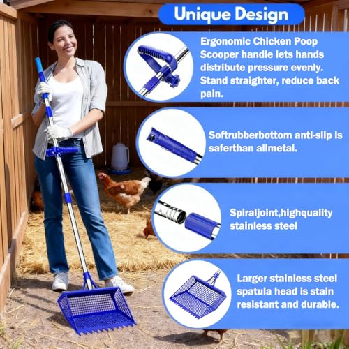 ?Premium 304 Stainless Steel — Rust-Proof & Durable for Year-Round Use?? Unlike cheap iron or plastic scoopers that rust in rain/snow or crack under heavy waste, our shovel head and handle are made of food-grade 304 stainless steel. It resists corrosion from chicken urine, beach salt, and cattle pen moisture — even after months of outdoor use. The ultra-smooth steel surface wipes clean with just water, and the solid construction won’t bend or break when scooping heavy clumps.