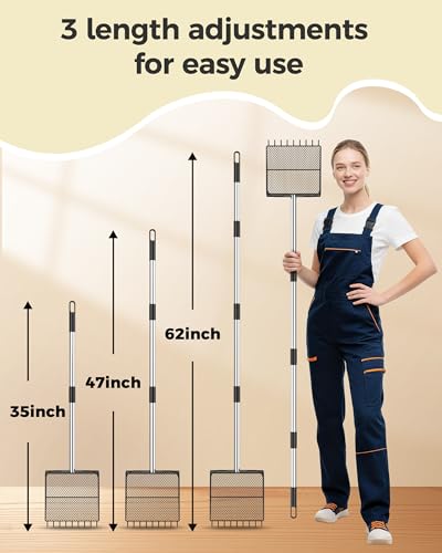 3-Length Adjustable,Fits All Users (35"-62"): This Chicken coop rake can be adjusted to four different specification length: 35 inches, 47 inches, 62 inches. The adjustable function makes it easy to use in various scenarios and for people of different heights. You can adjust it to the most suitable length according to your own needs