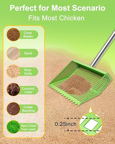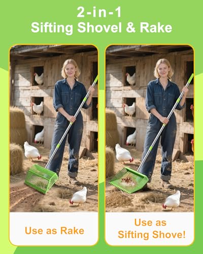2-in-1 Rake & Sifting Design?The perfect Chicken Poop Scooper and Rake Combo! Scrape droppings as a rake, then sift bedding as a coop scoop – no tool switching. Perfect chicken coop cleaning tool for efficient waste removal