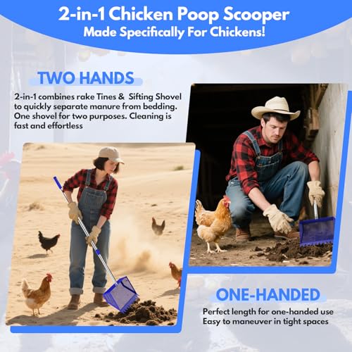 Chicken Poop Scooper & Rake 2-in-1: Stainless steel handle with adjustable rubber grip for single- or double-handed operation. Reduces hand and back fatigue, ideal for tall users, the elderly, and daily chicken coop cleaning. Back and knee-friendly.