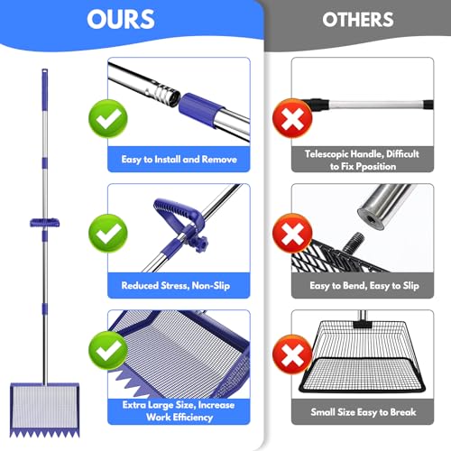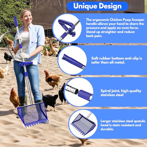 Large-Capacity Metal Chicken Poop Scooper : Constructed with a heavy-duty metal shovel head and rake, paired with a 304 stainless steel handle and an adjustable soft rubber grip, it is suitable for use year-round. The metal-toothed chicken manure shovel head measures 10 inches in width, with a curved groove design significantly increasing the shovel's capacity, enabling it to scoop and sift waste in a single pass, greatly enhancing work efficiency.