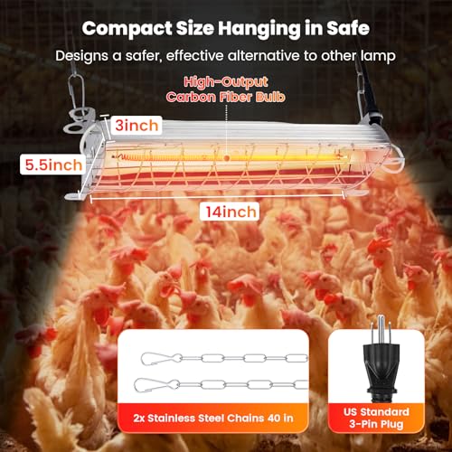 Upgrade Well Made and Durable Safety: The brooder heater built in stainless steel material. The Heavy-duty mentel grill helps to prevent damage to bulbs and animals. Anti-scald casing, and waterproof, plus stainless steel mesh cover, to protect your chickens in all aspects. our chicken coop heater power cord has gotten international UL certification, which is safe to use for your small animals, pet poultry, reptiles, and amphibians.