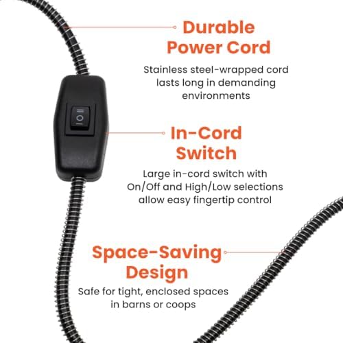 Energy-Efficient Heater: Using about 13% (200 watts) of the electricity of a standard 1,500-watt space heater, this heater is energy-efficient and saves you energy costs. The heater has a durable, protected electric cord that keeps your chickens safe.