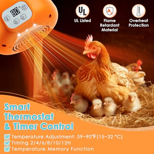 Safety Design: The chicken heater made of flame retardant material, the shell is insulated for a long time without heating up, with overheating protection to ensure the safety of the chicks during use. 5 FT ultra long power cord has UL certification, which further protects your poultry or pets