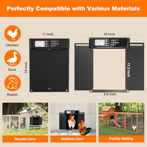????????????????????????????????????????????????????????????? ???????????? ???????????????????????? & ????????????????????-???????????????????????????? ???????????????? ?????????????????????????????Our Electric Chicken Coop Door features an intuitive large LCD screen, integrating timer, light sensor, and manual controls for effortless door operation. Its user-friendly design makes it simple to handle for all ages, including seniors. Crafted from high-grade aluminum alloy, it boasts exceptional hardness, withstands extreme weather conditions (-4°F to 140°F), resists deformation, and effectively deters predators to keep your poultry secure.
