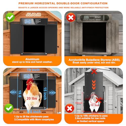 ????????????????????????????????????????? ????????????????-???????????????? ???????????????????????? & ???????????????????????????????? ????????????????????????????? ?Against vertical chicken coop doors, this horizontal dual-door has 3 key usability advantages: Wider Opening: At 11.6 x 8.6 inches, it fits larger chickens (up to 20 lbs). Vertical doors only suit under 10 lbs—bad for bigger breeds. ?Coop Versatility: Ideal for low-roof or vertical-space-limited coops. Vertical doors need extra overhead to open; horizontal slide solves this. ?Better Anti-Pinch Safety: Sliding design reduces pinching risk. Unlike vertical doors (guillotine-style, up/down), it removes "chopping" hazard if closing suddenly.