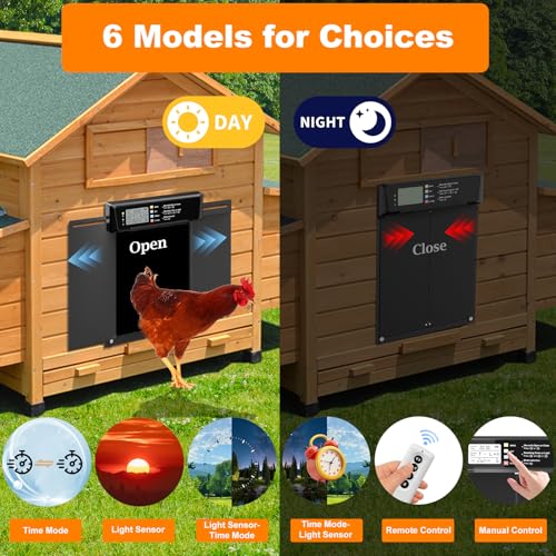 ????????????????????????????????? ???????????????????????????????????? ???????????????? & ???? ???????????????????????????????????? ?????????????????????After 4 years of research, we’ve developed a premium automatic chicken coop door. Its auto open/close (via light sensors & timers) is highly sophisticated, plus 2 manual options: 10m remote & door buttons—saving you early-morning/late-night chores. It offers 4 versatile modes to fit your schedule & flock: ?Light sensor: opens at sunrise, closes at sunset; ?Timer: set custom open/close times; ?Remote control: operate up to 49.2ft (no obstacles); ?Manual: open/close by hand anytime.