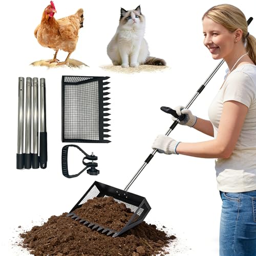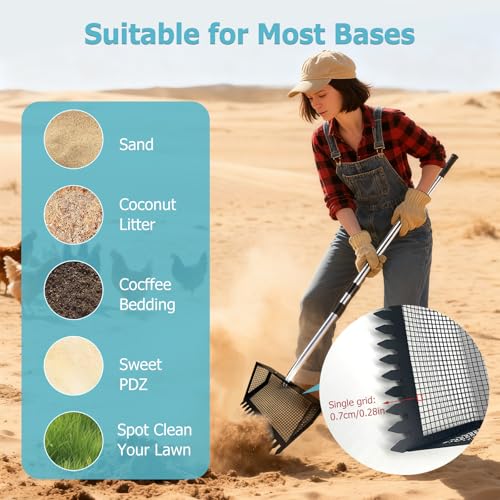 4-in-1 Scoop/Rake/Sieve/Leveler: A single tool combines scooping, raking, sifting, and leveling functions to effortlessly tackle coop cleaning. front rake tines easily insert coop sand and gather droppings and feathers while the sifting poop separates waste from bedding,a must-have coop accessory.