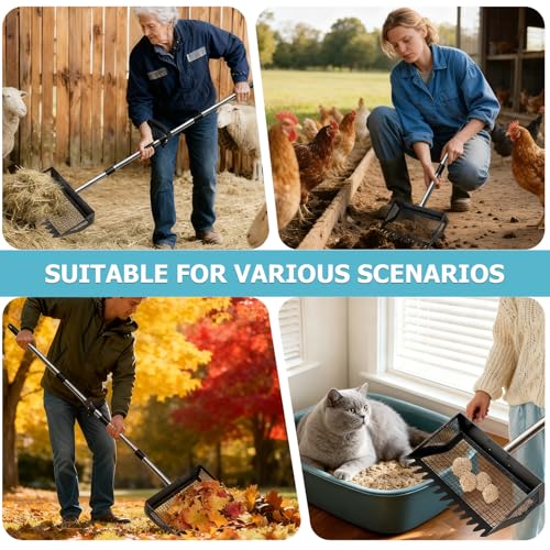 Multi-Purpose Chicken Poop Scooper: This chicken coop shovel desinged with rake teeth, enabling quick removal of chicken manure and other waste.Not only can it be used as a chicken manure shovel, but it can also serve as a cat litter shovel, beach sand shovel, and cattle pen shovel,or use as a rake for weeds, compost, sand, shells, and debris.Outside the farm, it doubles as a sandbox sifter, yard leaf scooper, or beach scoop.
