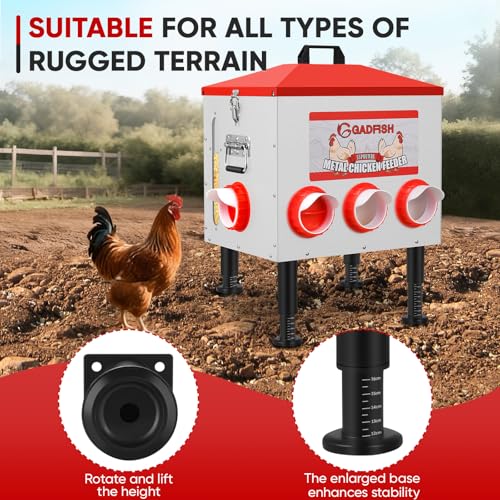 Upgrade Support Legs: No tools or removal of support legs - simply rotate the legs to easily adjust the height to meet the feeding needs of poultry of different sizes. It's that simple! The increased base contact area ensures superior stability on any terrain, which can effectively alleviate the feeder's sinking in soft grass or mud.