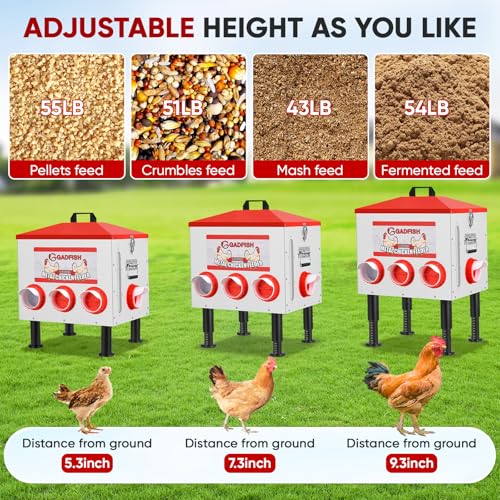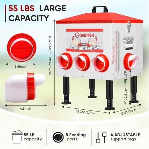55LB Large Capacity: GADFISH automatic poultry feeder can hold 55 pounds of feed. It has 8 feeding ports that can feed 8 poultry at the same time. Filling it up once can minimize the need for frequent replenishment, saving your precious time and energy.