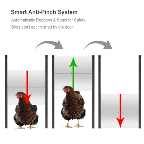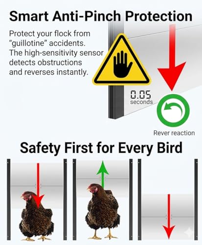 Advanced Anti-Pinch Safety: Don't risk a "guillotine" accident. Our sensitive pressure sensor detects any bird in the way, instantly reversing the door to prevent injury. Your hens' safety is our priority.