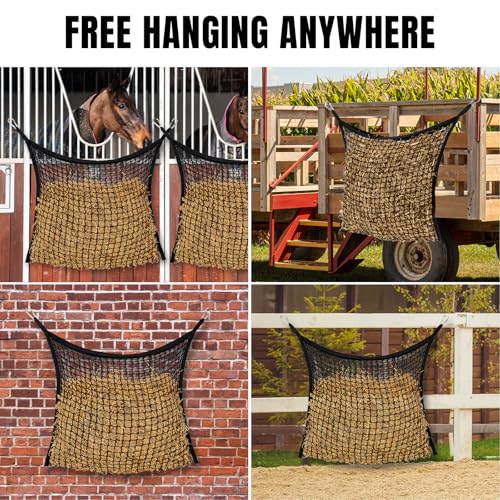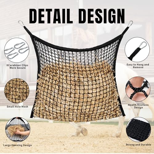 ?Quick Fill & Effortless Hanging?Spend less time prepping feed! The extra-wide top opening lets you stuff hay in seconds, while dual handle rings and center ties attach securely to stalls, trailers, fences, or walls in moments. Securing the mesh pockets is quicker and easier with the included carabiner clip. No tools needed—simply loop over hooks or rails for a stable, adjustable fit.