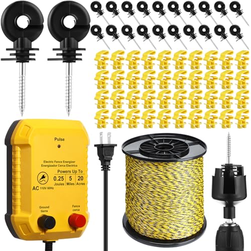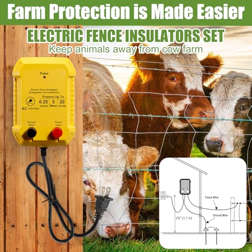 Rich Combination: you will get 1 pcs electric fence charger (2 Mile 110VAC 0.25 Joule Electric Plug in Fence), 1pcs 3366 feet/1026 meters hot electric fence wire in 1/8''/ 3mm diameter polywire and 9 stainless steel conductors, 40 pcs standard snug-fitting T-Post insulator - ITY-Z, 20 pcs black screw-in electric fence insulator with 1 pcs insulator socket tool, This electric fencing grid system kit equips you with need to set up electric fence, saving you time and effort