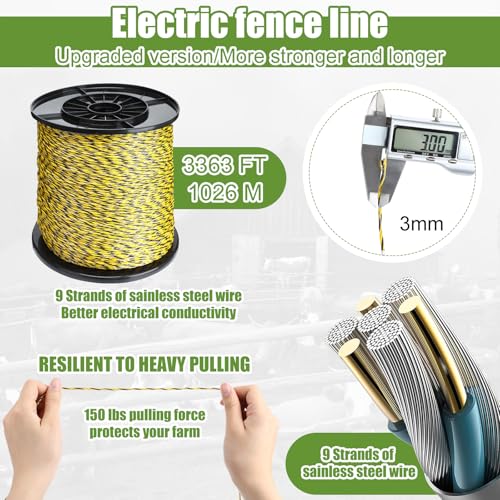 Reliable Polywire: this 3366 Feet (1026-meter) spool of electric fence polywire is upgraded to 1/8'' diameter; It contains 9 stainless steel conductors, made to resist rust and UV, offering more reliable performance than aluminum wire, which corrodes over time; The bright color stands out in the environment and provides excellent conductivity; Ideal for temporary fencing, it can withstand rain, snow, and won't degrade over time, ensuring long-lasting use and effective wild animal prevention