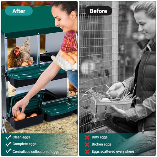 [INNOVATIVE EGG COLLECTION SYSTEM]Transform your egg collection routine with our chicken nesting box design! Featuring a gentle incline, each box allows freshly laid eggs to roll into a conveniently accessible tray, eliminating the hassle of reaching inside the nesting area. This design not only keeps your precious eggs safe but also streamlines daily farm chores. Say goodbye to messy egg collections and hello to an efficient, hassle-free egg harvesting experience that saves you time