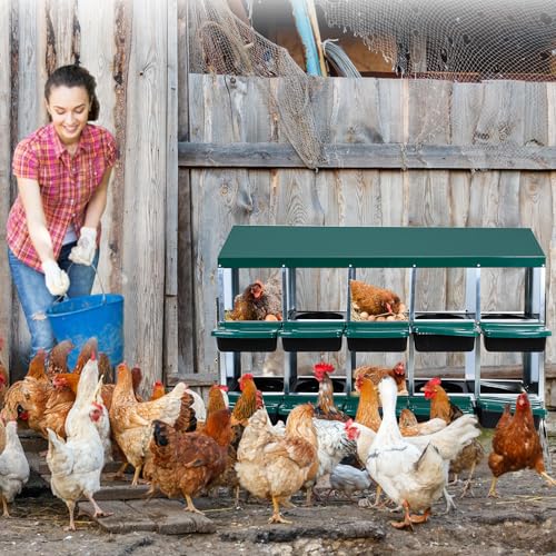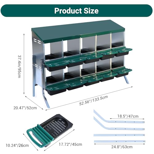 [BUILT TO LAST]Durability meets functionality in our chicken nesting boxes, thoughtfully crafted from rugged galvanized steel for the roof and sides. This ensures long-lasting performance, ventilation holes promote airflow, maintaining a cool and dry environment for your hens. The removable trays, constructed from rust-proof plastic, make cleaning and maintenance a breeze. Invest in a robust product that balances strength with comfort, ensuring your hens enjoy a safe and pleasant laying area.