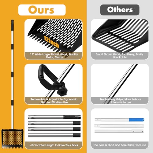 Ergonomic Design: Our pooper scooper, ergonomic 53" long pole design with a adjustable ergonomic grip comfort handle, it is easy to wield without straining your back, the design takes into full consideration the user experience