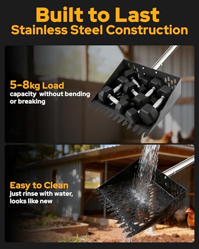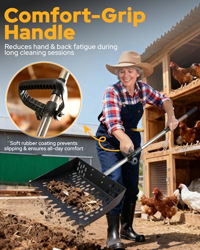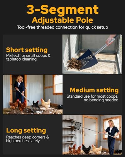 ?Sturdy Metal Construction & Easy-Clean Surface?Featuring a carbon steel scoop head and stainless steel adjustable shaft, this tool avoids the fragility of plastic alternatives. Its robust design prevents loosening or breaking during use. Simply rinse with water or a hose after cleaning for immediate reuse. This chicken manure scoop is built to meet your poultry cleaning needs for years to come.
