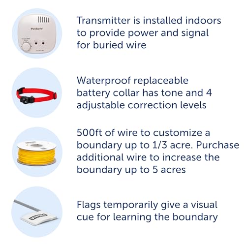 Easy DIY Installation: The Basic In-Ground Fence System contains an indoor transmitter, boundary flags, and customizable settings for a weekend DIY setup; covers up to 1/3 acre with included wire