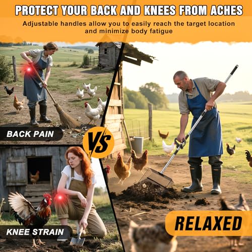 5-in-1 Adjustable Stainless Steel Handle - Adjusts from 24“ to 68” with a simple swivel threaded connection for ease of use for different height situations. Great for cleaning up chicken manure, horse manure, dog manure piles, cleaning out sandboxes, and shoveling hay and straw!