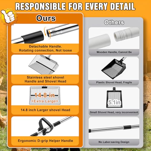 The 15-Inch Extra Wide Chicken Coop Shovel has a 15-inch extra wide shovel head made of industrial-grade metal, allowing you to cover more ground with each cleanup. Its wide design speeds up work and increases efficiency, helping you save time and energy in your daily cleanup. It's perfect for chicken coops, horse stables, leaf piles and other farm cleaning tasks!
