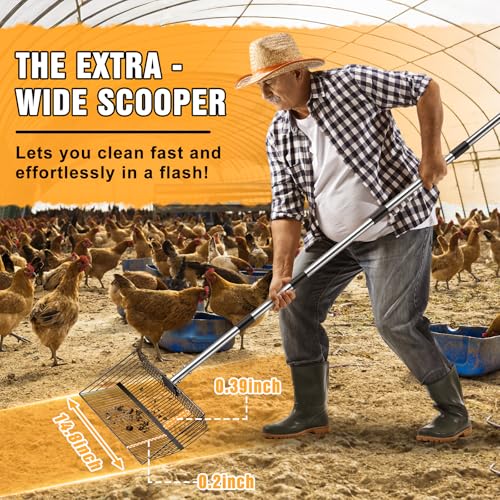 Extra-Large Metal Scoop with Dual Width Design: The 12-inch wide scoop features a unique dual-width partition design, with wide gaps of 0.28 inches and narrow gaps of 0.18 inches, catering to different cleaning needs. The chicken coop scoop's ability to quickly separate waste from bedding like sand and coarse wood shavings doubles your efficiency, saving you valuable time and energy.